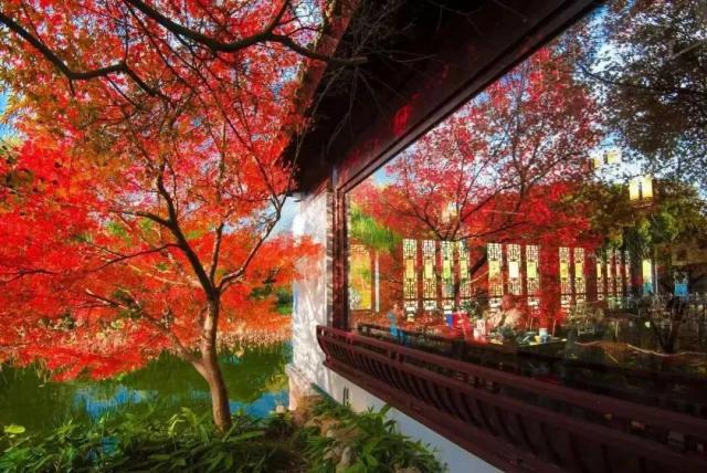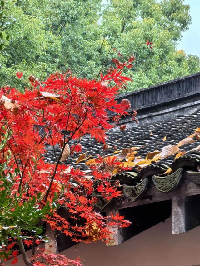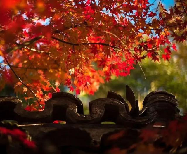 在古代的花园里,红叶又有了另一种魅力。青竹与红枫相得益彰,一青一红,一刚一柔。