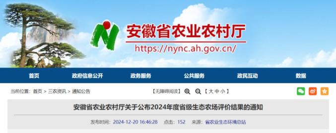 十二月二十日,安徽省农业农村厅网站发布了《安徽省农业农村厅关于公布2024年省级生态农场评估结果的通知》,全文如下: