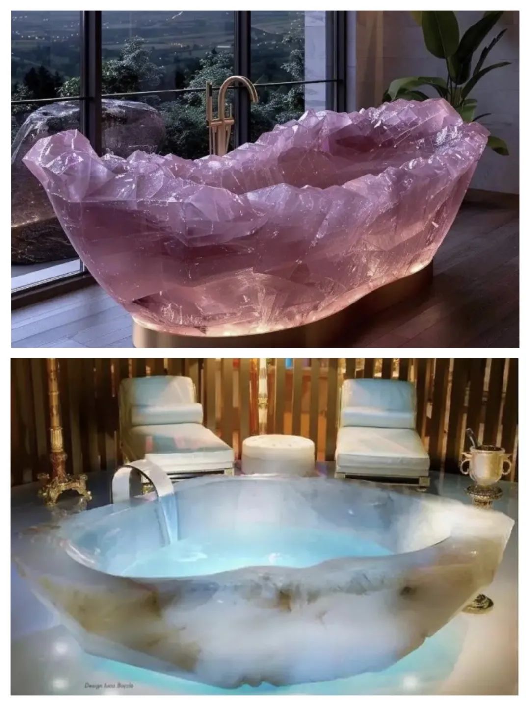 史上最治愈浴缸进而全球最贵浴缸,分别由粉水晶和白水晶制成。