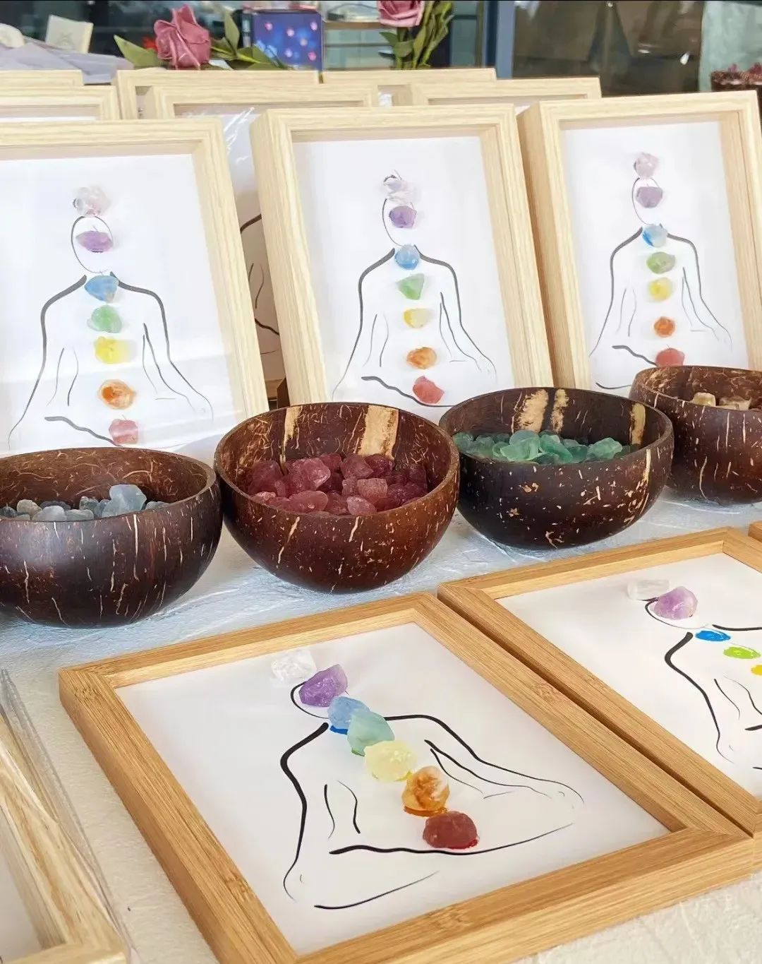 还有水晶原石做成的发财树和能量画,没什么技术含量却让老外对它的能量深信不疑。
