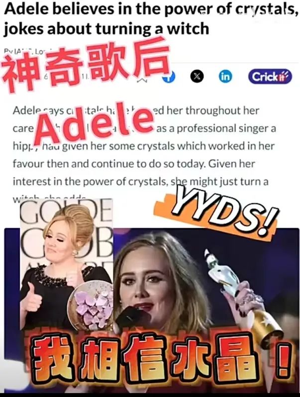 歌手阿黛尔曾表示,戴水晶能克服舞台恐惧症,偶尔一次忘戴就出了重大舞台事故。