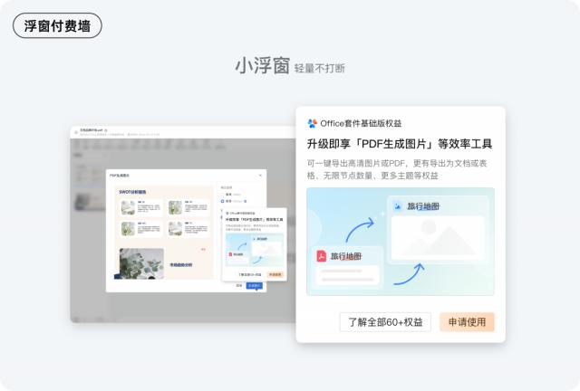 通过同创,问题逐渐浮出水面:业务初期的钉钉。 Office 套件主要通过全方位的“碰墙”——即强制阻挡使用或降级功能来促进转换。虽然见效快,但降低了客户体验,无法有效构建用户的付费心态,难以释放更大的增长势能。因此,设计师需要重新思考如何防止用户“到处碰壁”,创造更高质量的转换。