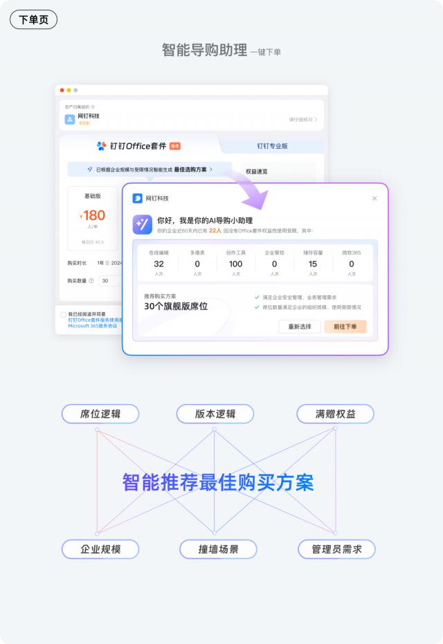 如果用户从“碰墙”链接进入订单页面,可以根据自己的身份、组织规模、“碰墙”前后的信息,为用户提供定制的导购服务:对于个人消费者,可以一键向组织管理员申请座位,或者引导他们进入开票流程进行报销,减轻决策负担;对于组织管理员来说,系统会根据企业规模和具体场景一键生成最佳的采购建议。绕过过去繁琐的购买逻辑,有效地提高了转化率。