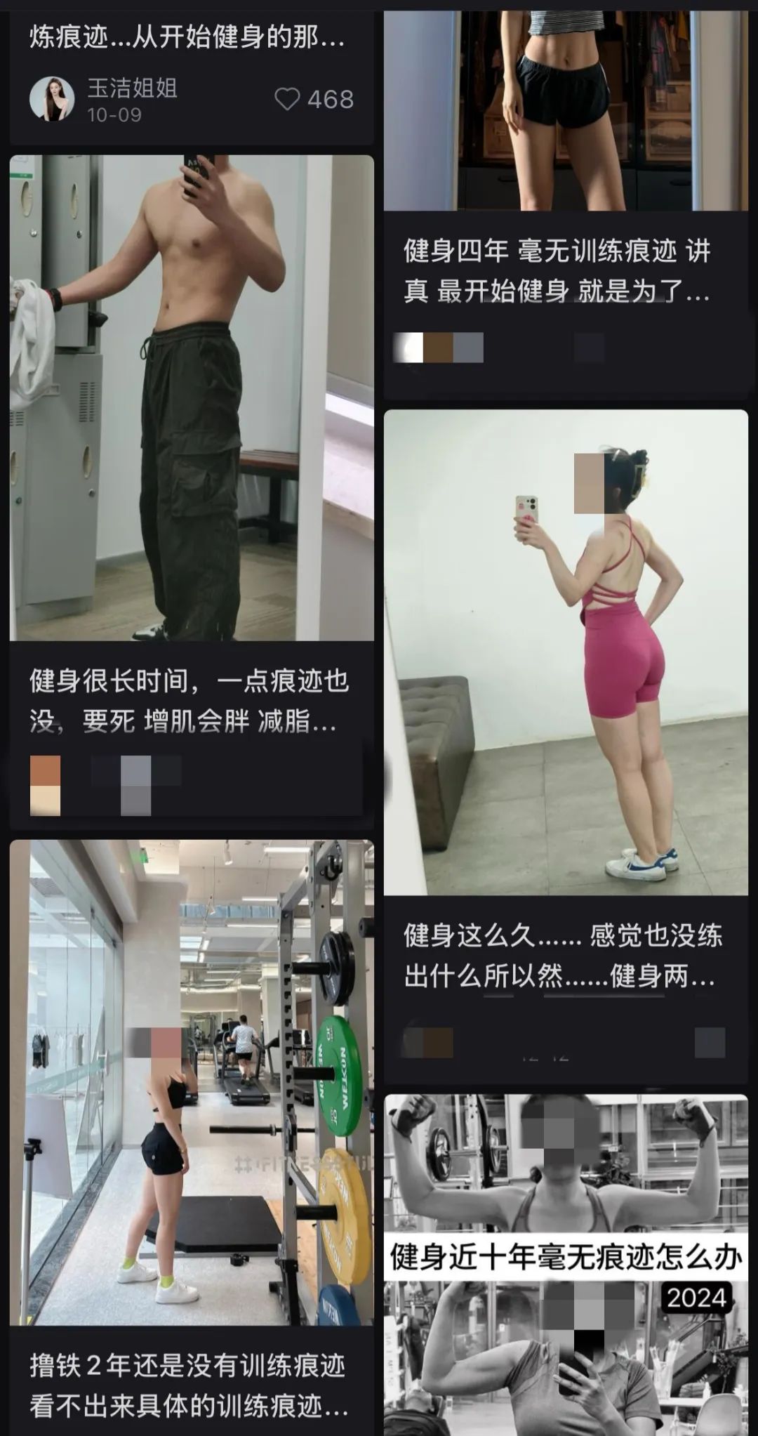 在社交媒体上,健身博主也通过展示自己的健身痕迹来标榜自己的健身水平和身材,健身多年的健身人员用健身痕迹来估计健身效果的进步。,而「没有健身的痕迹」同时也成为否定一个人健身成果的判断。