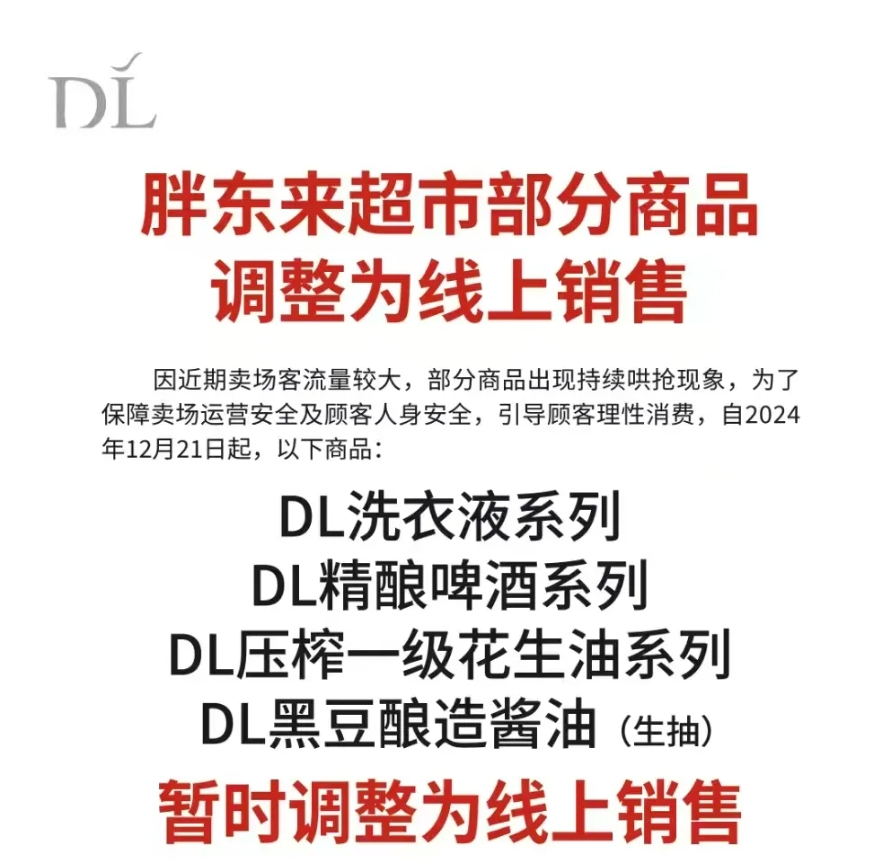 公告显示,由于近期胖东来门店人流量较大,部分商品不断被抢,为确保门店运营安全和客户人身安全,引导客户理性消费,自2024年12月21日起,DL洗衣液系列,DL自酿啤酒系列,DL榨取一级花生油系列,生产酱油的DL黑豆(酱油)暂时调整到在线销售。