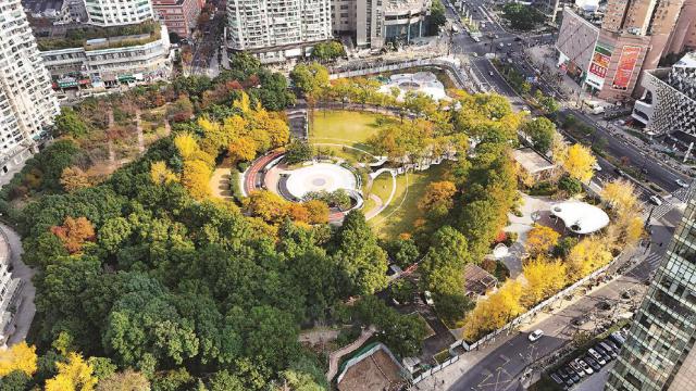 另外,位于长寿公园中心的下沉式圆形广场也在这次改造中以城市聚场为中心。 · 绿色森林是重建的特点。在这里,原中轴两侧的草地北侧上升,原来的遮挡景墙被拆除,而不是水景、超大陡坡草坪和旋转楼梯,兼顾座椅功能。