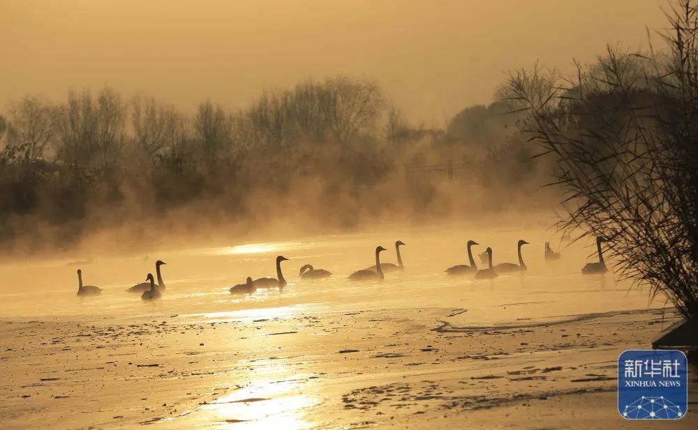 ● 冬天的魅力。十二月二十二日早晨,甘肃张掖国家湿地公园里长满了寒雾,天鹅悠闲地生活着。