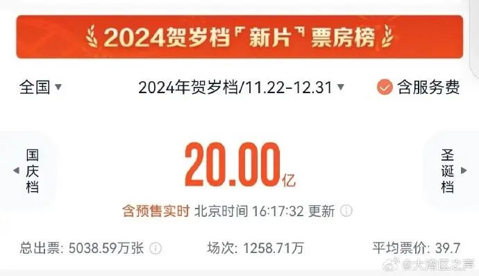 ● 2024年贺岁档电影票房突破20亿。根据网络平台数据,截至12月22日16时17分,2024年贺岁档(11月22日至12月31日)档期电影票房(含预购)突破20亿。