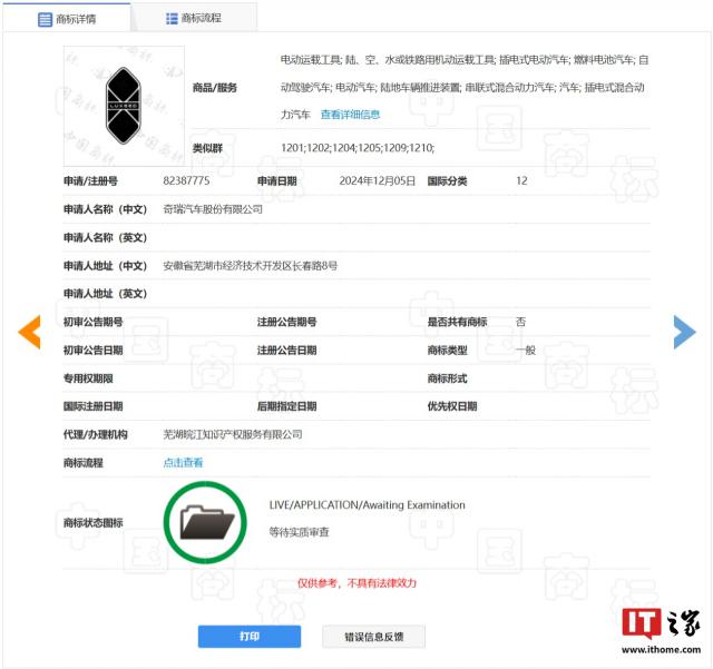 IT 据世家调查,奇瑞申请的智能图形商标目前正处于“等待实质性审查”阶段,包括国际分类。 12 和 37 两类,申请 / 注册号分别为 82387775 和 82383305,涉及的商品 / 服务包括: