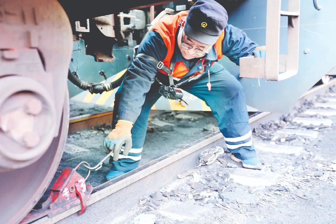 12月15日11时,三都站专用线上装载了一辆28节的电煤车。阳泉站白羊墅运营车间第11调车组连接员杨凯利“钻”进狭长的煤仓检查车辆。他有时在冰冷的平台和车间俯下身,有时站起来,仔细检查道心是否有残煤、车辆连接状态、是否有“关门车”等。
