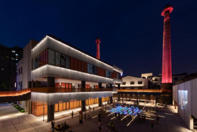 在工厂更新改造的过程中,团队一直在思考如何保留和融入园区的工业特色。“起初,人们对旧工厂的烟囱改造有不同的想法。有人认为拆除不安全,也有人认为可以像世博园一样制作温度计。“园区负责人表示,从安全建设和运营的角度来看,经过系统检测,决定保留两个原始的保温瓶胆厂。 50 米饭烟囱,现在,这也成了园区的一大特色景观。