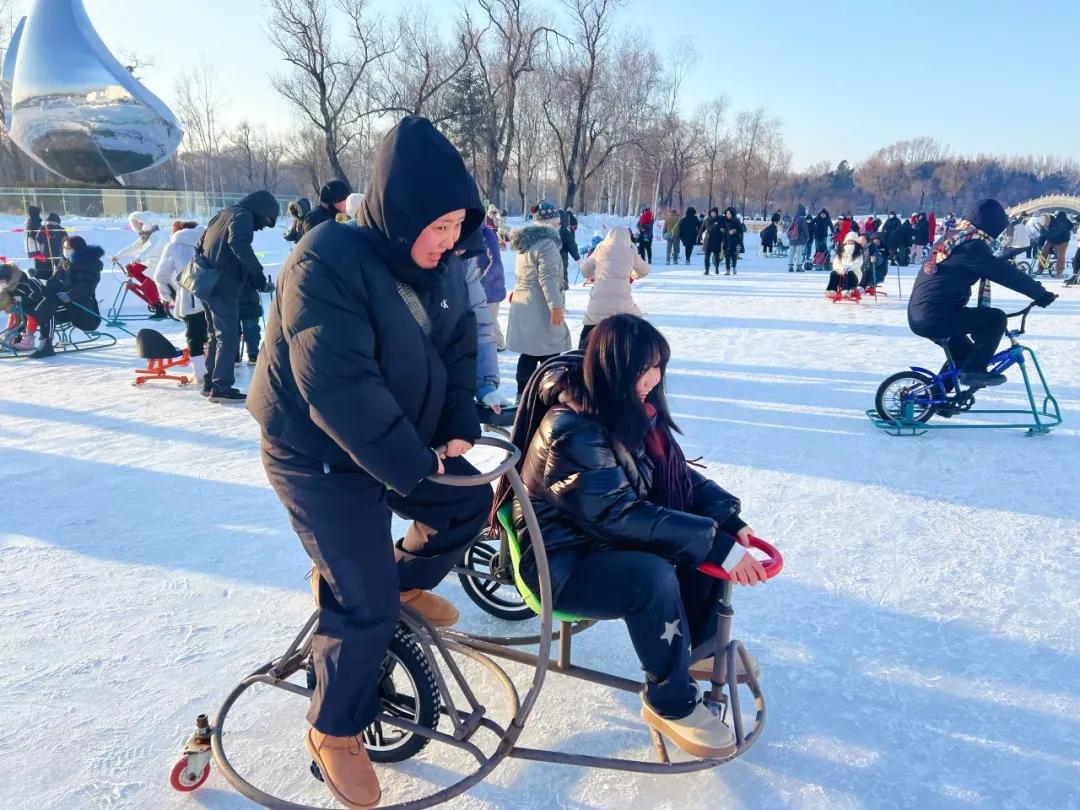 除了笨熊公园的游乐项目,你还可以在太阳岛雪博会的太阳湖玩冰上自行车和陀螺。你不仅可以在这里体验冰雪的快乐,还可以和你的孩子一起玩。