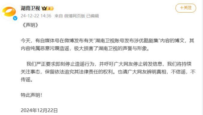 十二月二十二日下午,湖南卫视发表声明回应:今天,有媒体号在微博上发布了一篇关于“湖南卫视账号发布涉优酷剧”内容的博文,内容纯属恶意污蔑造谣,极大地损害了湖南卫视的声誉和形象。