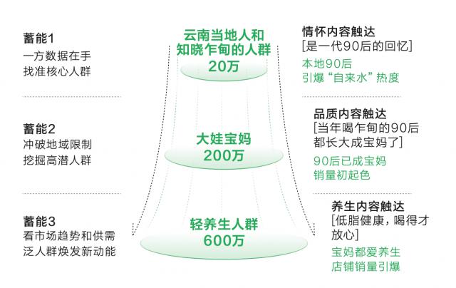 让我们来看看乍甸乳业的案例。一个云南的老品牌一直无法跨越云南的边界,但是通过对小红书种草营销策略中心的分析,我们可以发现,那些曾经在乍甸长大的人。 90 之后的孩子大多已成为宝妈,并已分散到全国各地,这些人群是点燃品牌口碑的关键群体。从这 20 通过分析他们的喜好,万核心群体开始将健康和维护作为破圈的关键点。最后,乍甸将种草群扩展到 600 万。