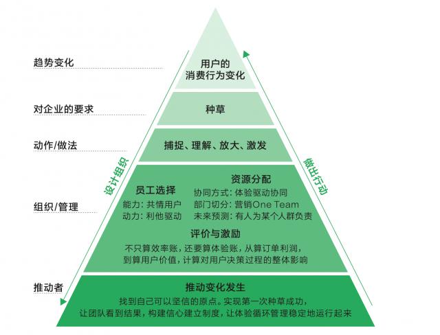 为了应对这两个障碍,公司可以走上种草组织的正轨。为了让公司事半功倍,《种草》一书将“种草组织”的设计理念概括为一个包括五层要求的“金字塔”: