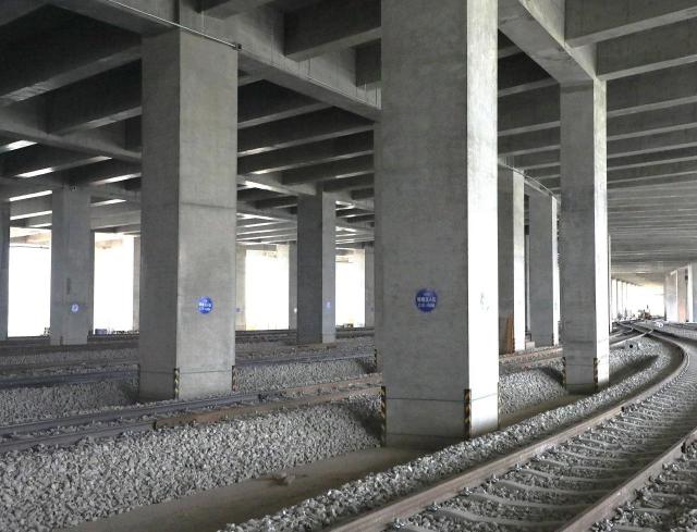 东宝河停车场 631 所有的根柱都是采用的“镜面混凝土”施工技术,柱子颜色光滑平整,大方均匀。