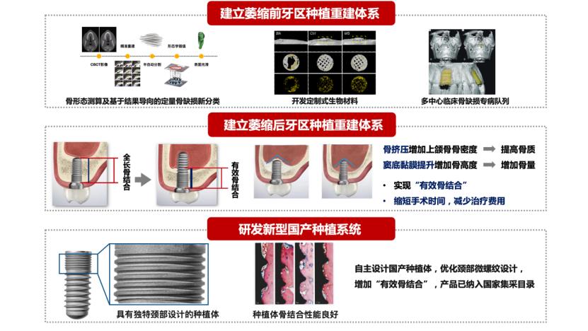 研究小组面临着从实验室到临床治疗的诸多挑战,如何将研究成果产业化是一个重要节点。为更好地实现项目组建立的新手术系统,项目团队与国内公司密切合作,通过技术转让和联合开发,开发了一种新型的国产种植系统,改进了种植体颈部形态设计,从而获得更强的有效骨结合,同时将新型种植系统从实验室推向市场,打破了进口产品的垄断,降低了治疗费用,促使更多牙槽骨萎缩患者能够承受种植治疗,重新获得健康美丽的微笑。