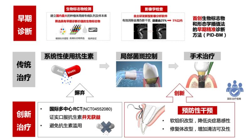该项目组建立了中国最大的种植体周病专用生物样本库,并对110名专用疾病患者进行了10年的随访。首次建立了适合中国人的种植体周病风险评估和预测模型,可以有效预测患者种植体周病的风险,制定个性化的维护方案。项目组对一系列初始生物标记进行了筛选,并独立开发了图像分析软件,可以识别初始骨骼破坏,将传统偏差从25%降低到5%以内。结合影像检测技术、微生物检测技术、生物学分析等学科,实现种植体周病的精确早期发现。此外,项目组还参与了制定国际种植体周病治疗指南,特别是S3级(最高级)国际治疗指南,提出了基于中国患者特点的治疗建议,不仅提高了中国牙科种植领域的国际影响力,也为全球牙科种植体疾病的诊断和治疗提供了宝贵的参考。