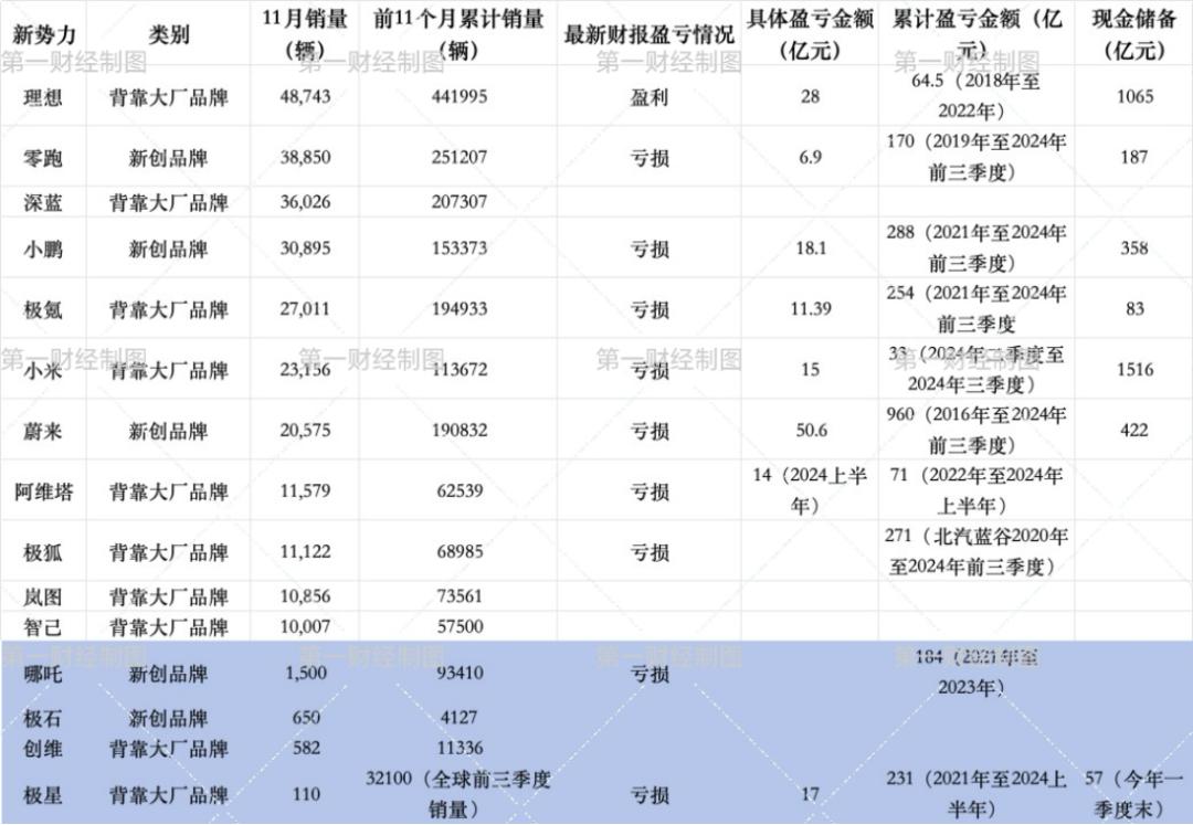 看看2024年前11个月国内新力量产品的销量排名。(理想背靠大厂品牌的说法并不准确)