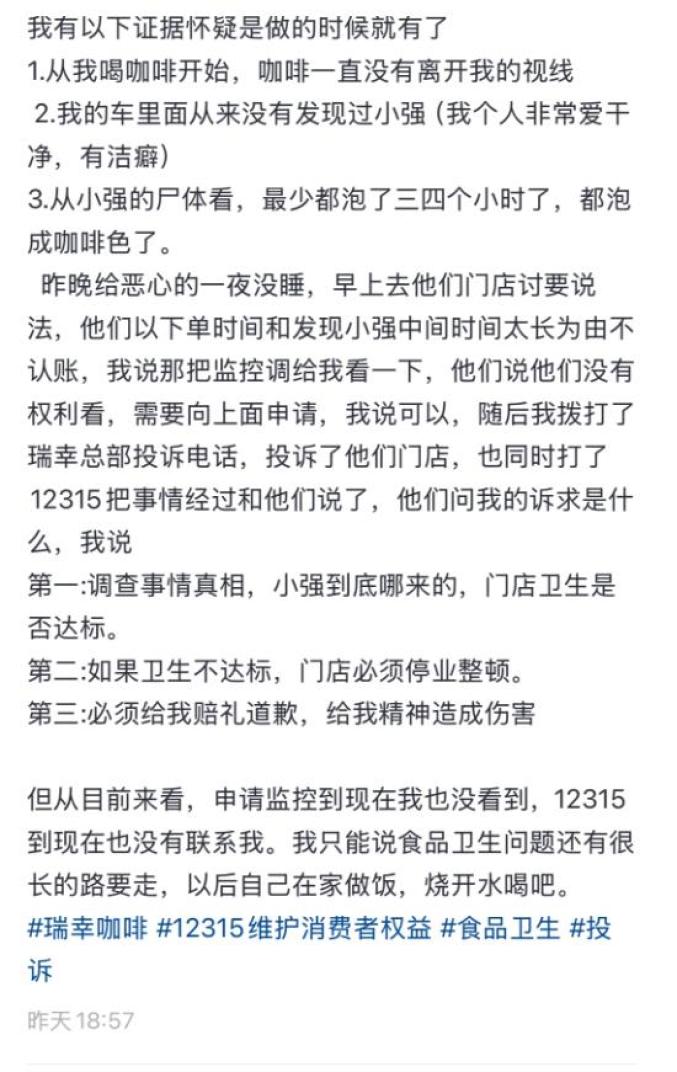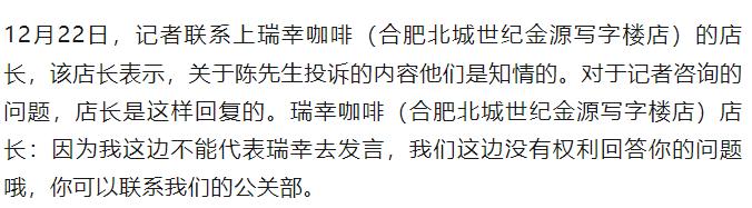 因为一时生气,拍完视频就扔掉了咖啡。当陈先生回到家时,他越来越生气。第二天(21日)上午,陈先生来到他的线下咖啡店——瑞幸咖啡(合肥北城世纪金源写字楼)投诉。