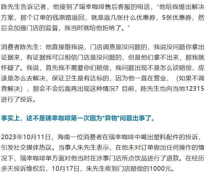 后来店里给陈先生打了一个瑞幸咖啡总部的电话,没有太多回应。陈先生打电话给瑞幸咖啡总部反馈情况,打开瑞幸咖啡总部发来的售后链接,上传异物照片。