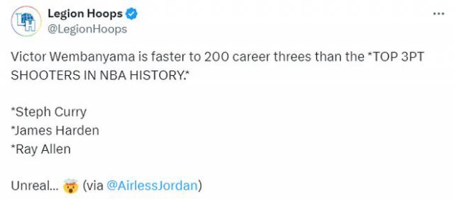 北京时间 12 月 23 日,美媒 Legion Hoops 他说,文班亚马生涯命中注定。 200 一个三分球的速度,比 NBA 历史上最伟大的三分射手都很快,比库里、哈登和雷 - 阿伦。