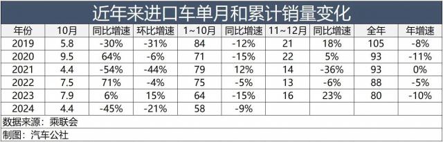 因为 10 当月,我国进口汽车同比下降。 45%,创下近几年同期最低水平,所以不乏高喊“进口车垮台”的声音。