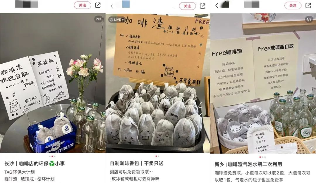 长沙的泰阁咖啡会在店里准备一个咖啡渣包和一个泡泡水玻璃瓶,供顾客免费领取。咖啡渣包可用于吸湿除臭,玻璃瓶可插花或二次创建。