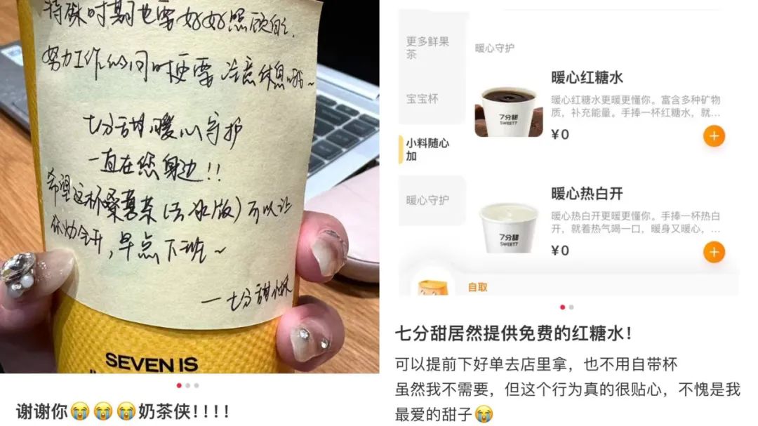 「不能在非常时期喝冰,店员居然送了一杯红糖水」「姨妈送红糖姜茶,的确有暖意」…