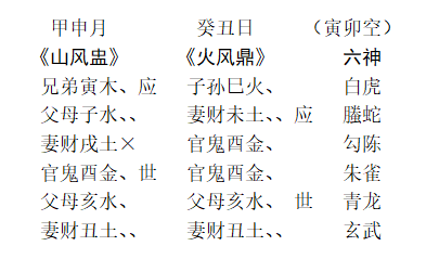 分析:二卦父母的海水是一栋房子,紧贴世卦,化泄世卦的活力,海水冲向后代,月建申金与四火相结合,财富受损。三卦是门官鬼居之门,消耗金钱之门,四卦财富又化鬼泄,这些都是消耗金钱的原因。世卦鬼化鬼临朱雀,四卦财生鬼,月建临鬼,子孙伏藏,鬼无制,必有官非口舌,同时身体有病。