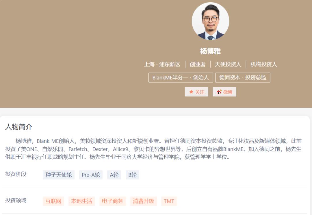 根据IT橘子显示,blank Me半点一的创始人杨博雅,是美容界的资深投资者和前沿企业家。杨博雅毕业于同济大学经济与管理学院。毕业后,他担任汇丰银行战略规划主任和德同资本投资总监。他专注于化妆品和新媒体领域的投资项目,并投资了自然公园。Farfetch、Dexter,Allice9、黎贝卡的异想世界等等。