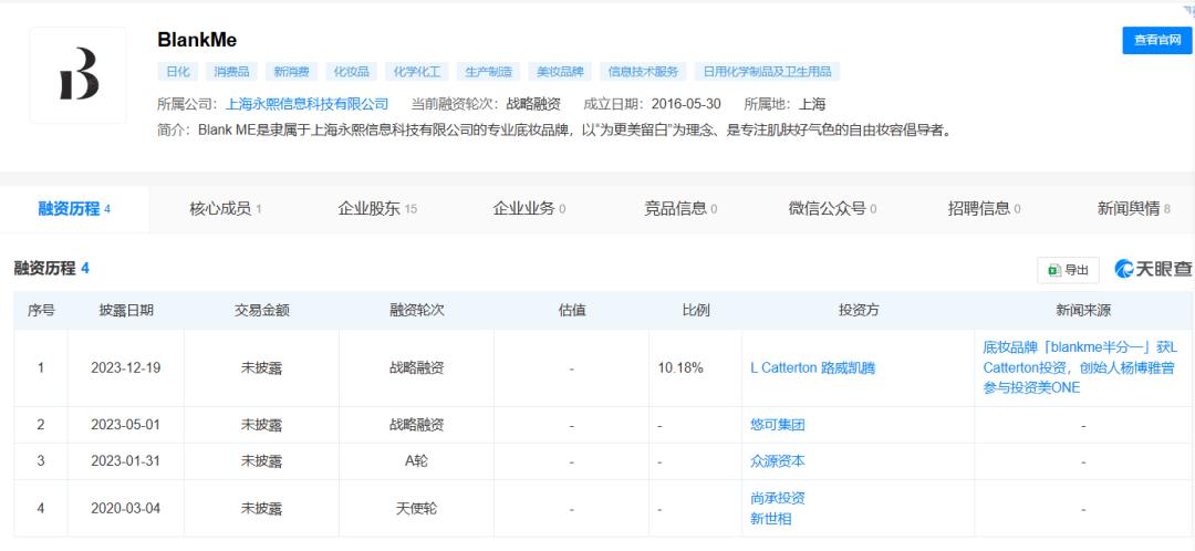 除了备受争议的路威凯腾投资外,在杨博雅投资者背景、品牌本身的快速飙升等加持下,blank me半点一共完成了三轮融资,分别在2020年进行了一轮融资,投资者为新世界和尚承投资者。;2023年进行了两轮融资,投资者包括悠可集团和众源资本。。
