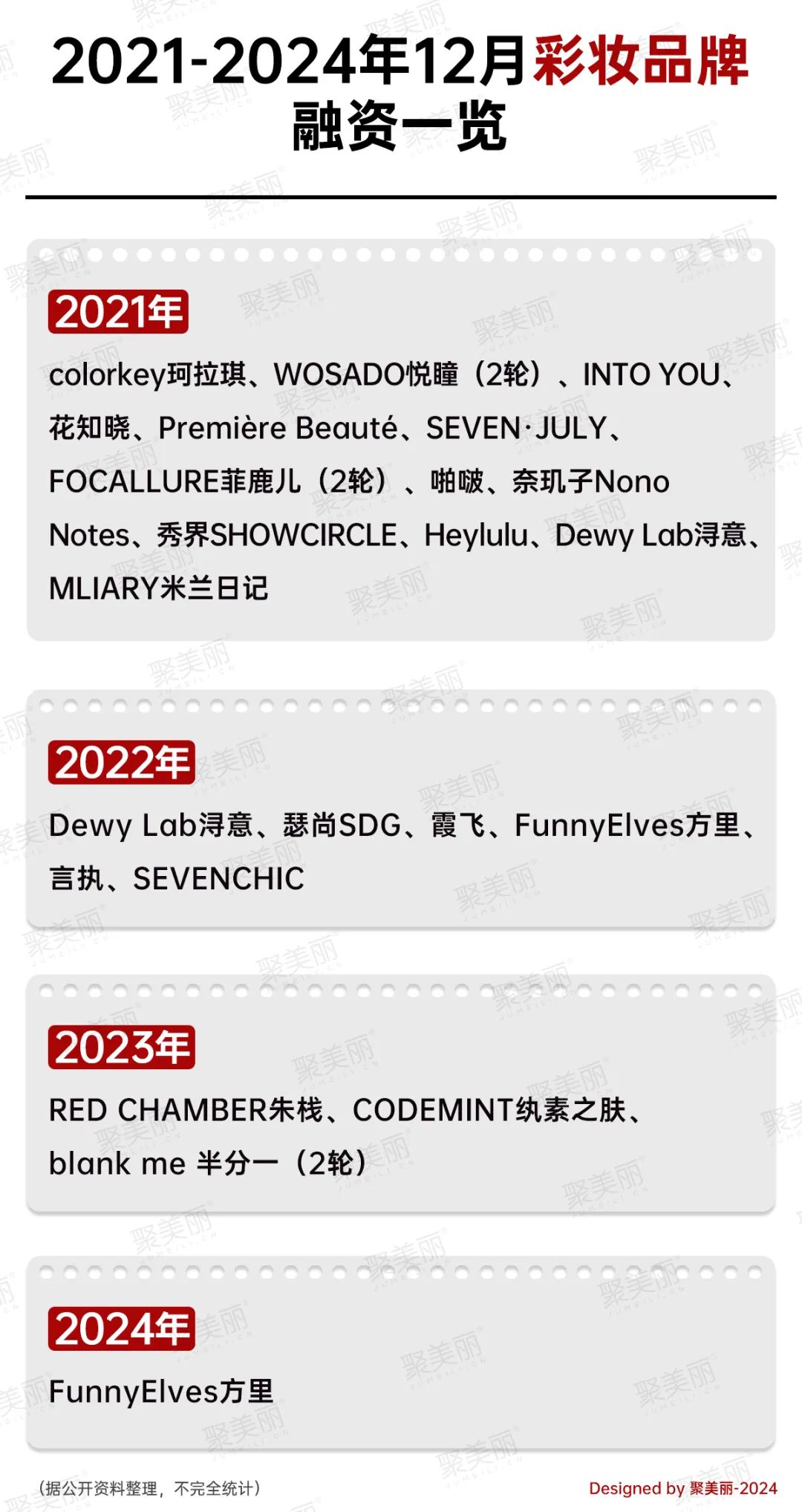 其中,就2021年以来美妆品牌投融资的对比而言,获得投资的品牌数量急剧下降。据不完全统计,2021年共有13个国产彩妆赢得了投资者的青睐,2022年仅有6个彩妆突然下降超过50%,而2023年则下降至3个。今年以来,公开表示,只有FunnyElves投资彩妆跑道。