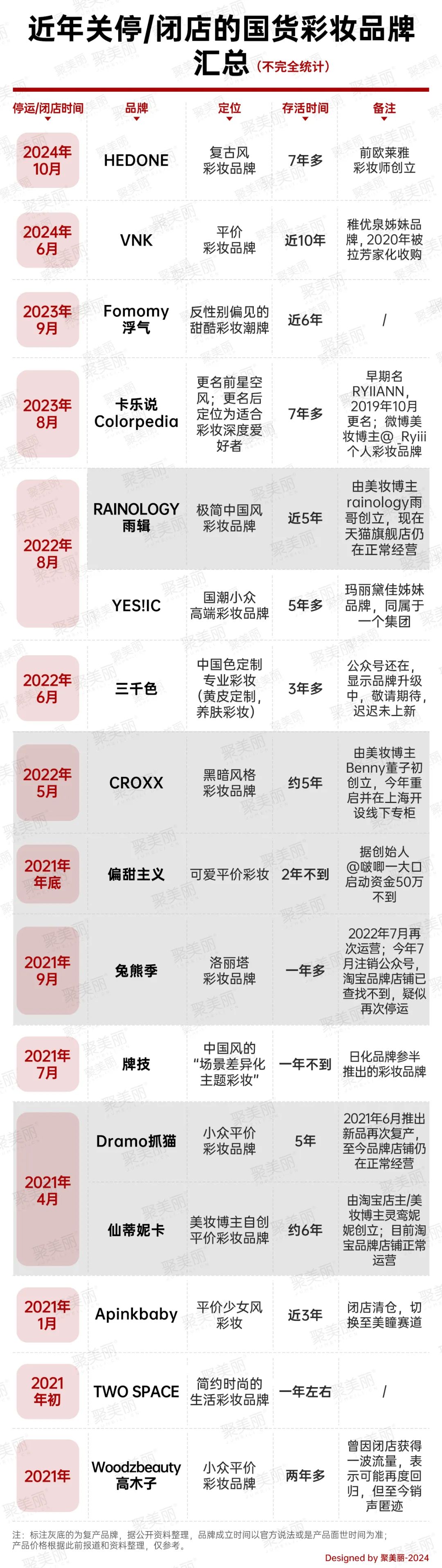 不仅如此,据聚美丽不完全统计,近几年有近30起新锐彩妆案例倒地,其中有YES!IC、Fomomy浮气等背靠大企业或曾经是视频、天猫彩妆品类第一品牌。