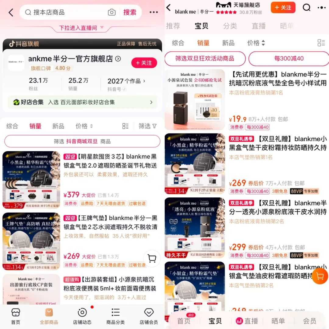 天猫官方数据显示,2022年618,blankme半点一在天猫底妆榜上排名第四,其中大型单品锁光精华粉底霜 (小黑盒) 超级清柔焦粉底霜 (小银盒) 预购期间销售额达到10万,直播间销售额超过1000万。