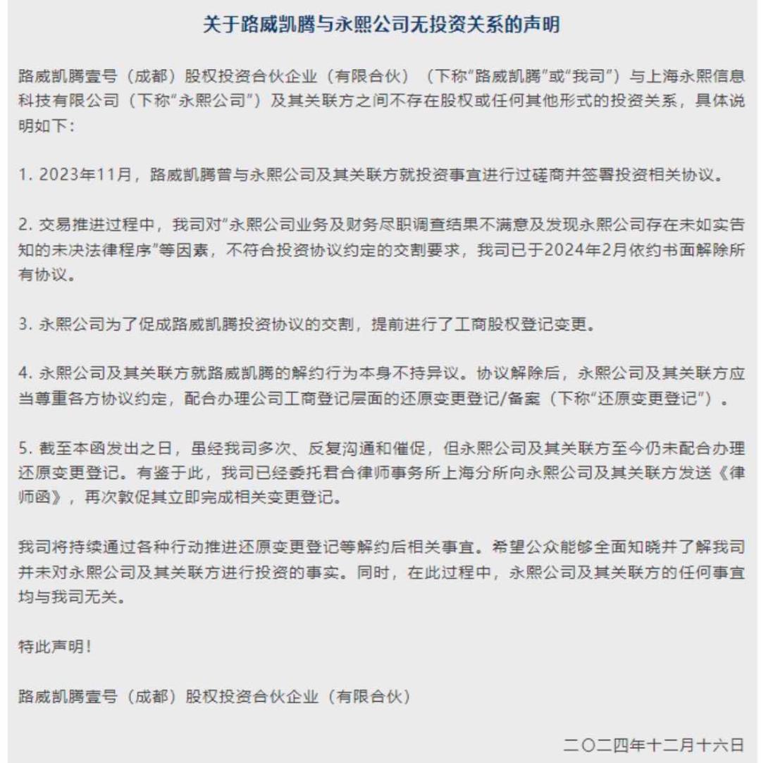 几天前,路威凯腾单方面发表声明称,路威凯腾一号(成都)股权投资合伙企业(有限合伙) (以下简称“路威凯腾成都基金”) 与上海永熙信息科技有限公司 (以下简称“永熙公司”) 与关联方之间,没有股份或其他形式的投资关系。