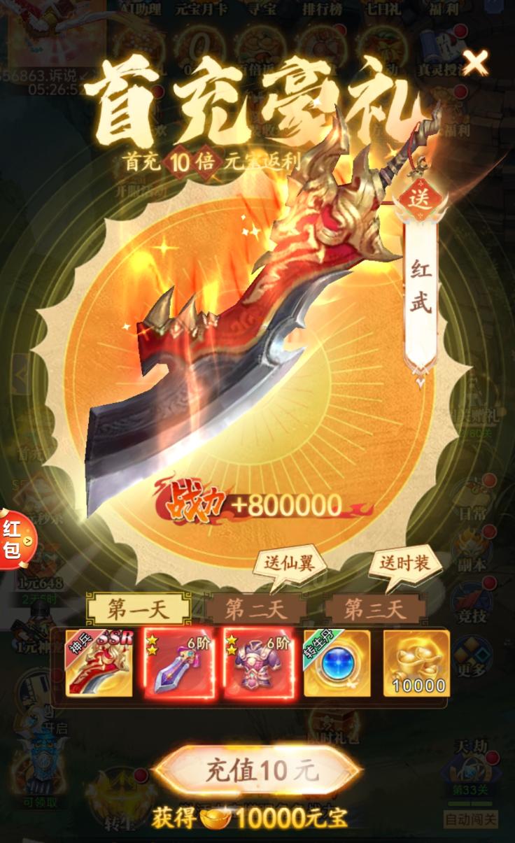 同时,游戏中的各种充值入口也开始不断弹出。什么样的充值? 十元,得宝刀,加 80000战力。图穷匕见,想从我口袋里掏钱。