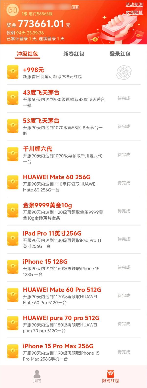 正如我们开服一样 90天里,升至 1050级,可以直接喜提 3888 块状很红包。