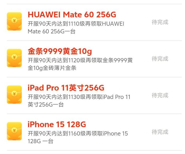 由于他再往上够一够,升级几级,就可以免费白嫖一台。 iPhone 15 或者 HUAWEI Mate 60。