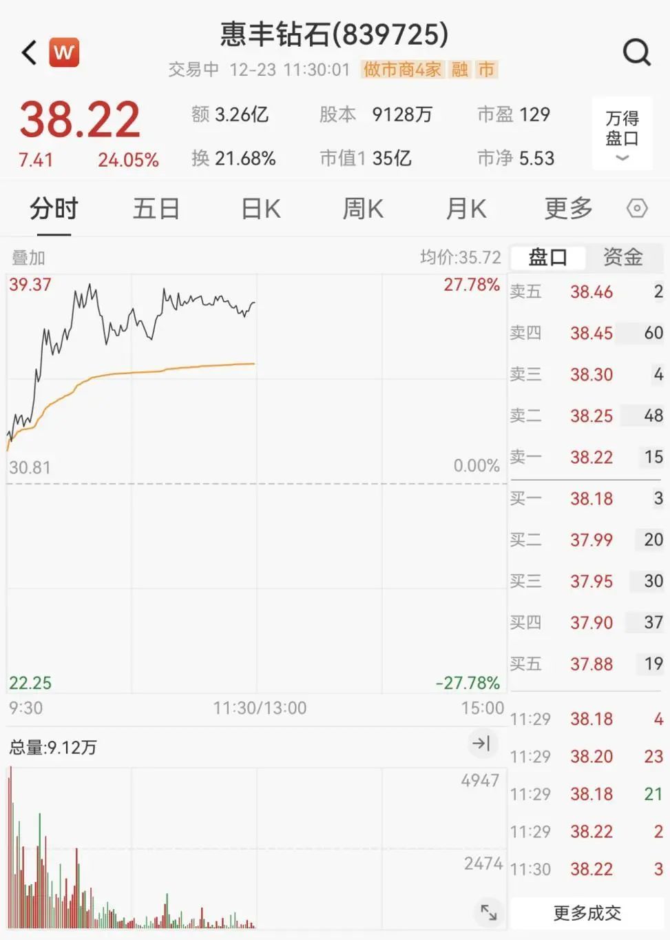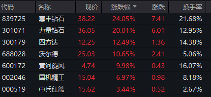 培育钻石板块盘里拉涨,惠丰裸钻涨幅超过24%,力量钻石涨幅20CM,四方达,黄河飓风,沃尔德等。