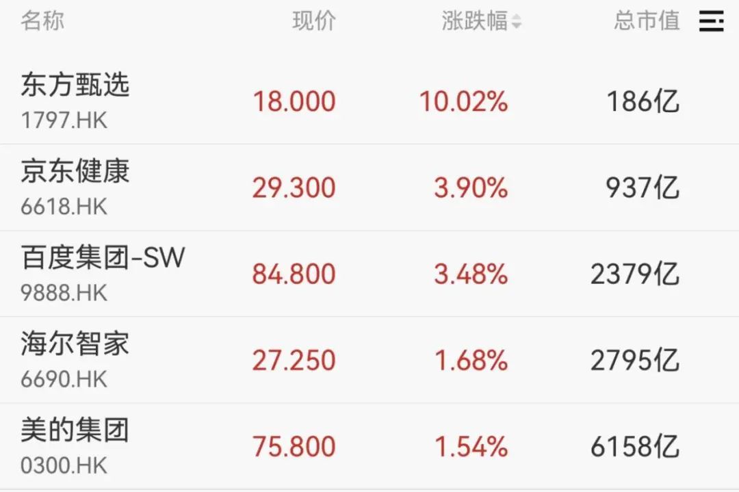 三大港股指数开盘走高,随后震荡调整。个股方面,东方选择涨幅超过10%,京东健康、百度集团、海尔智家等等。