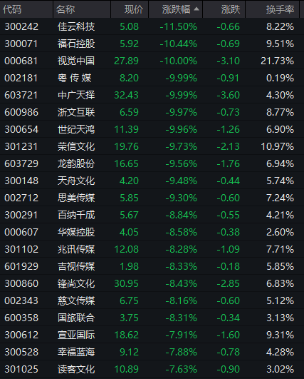 AI应用方向集体下降,虚拟人、教育、文化传媒板块跌幅居前,佳云科技、福石控股均跌幅超过10%,视觉中国、广东传媒、中广天择、浙文互联等多只股票跌幅居前。