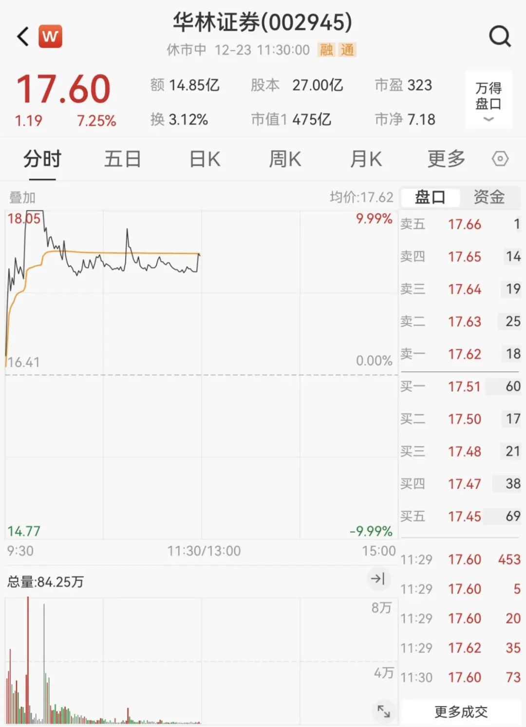 另外,华林证券盘中一度涨停,随后震荡调整,截至中午收盘,该股上涨7.25%。