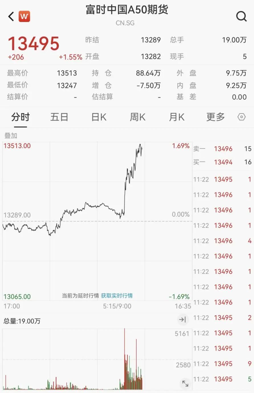 中国A50期货在富时迅速上涨,涨幅超过1.5%。