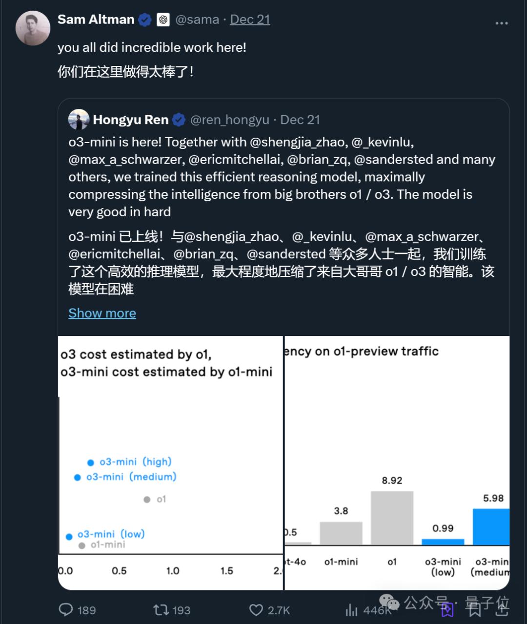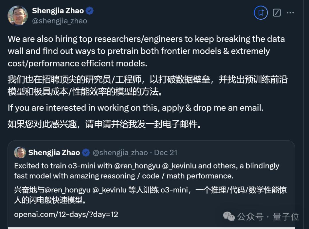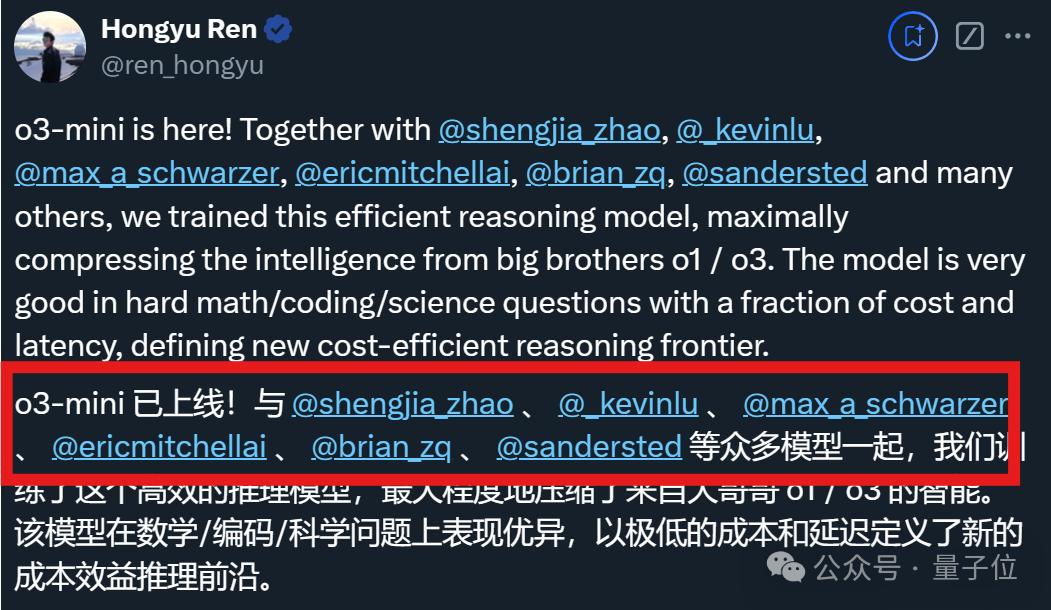 包括o3-mini在内,3位华人(任鸿宇,赵盛佳,Kevin Lu)几乎形成了一个固定的搭子,也一起负责过去。GPT-4o mini/o1 mini。