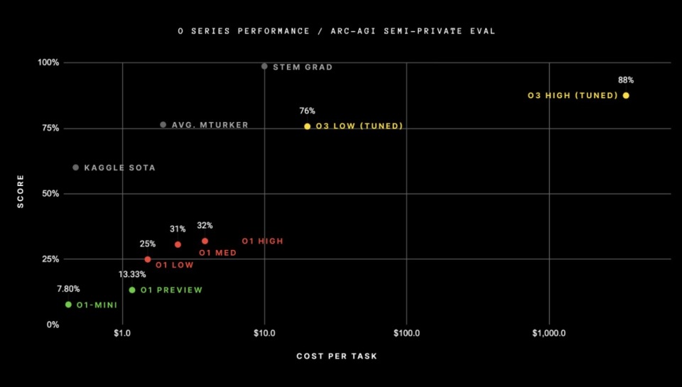 为什么o3的分数远远超过o1?同样,为什么o1的分数远远超过GPT-4o?在我看来,这一系列结果为普通人工智能的持续追求提供了一个非常有价值的数据点。
