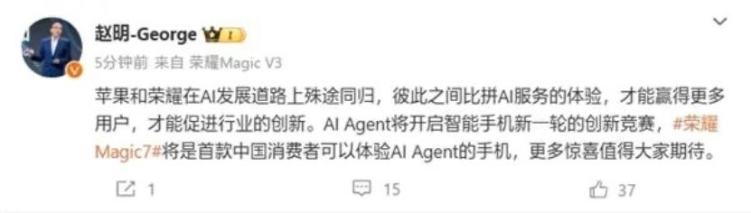 此前,荣耀CEO赵明曾经预测过Magic7系列,并表示这将是第一款中国客户体验AI的产品。 Agent的手机,“领先苹果”。和前东家华为“遥遥领先”的口号完全一样。