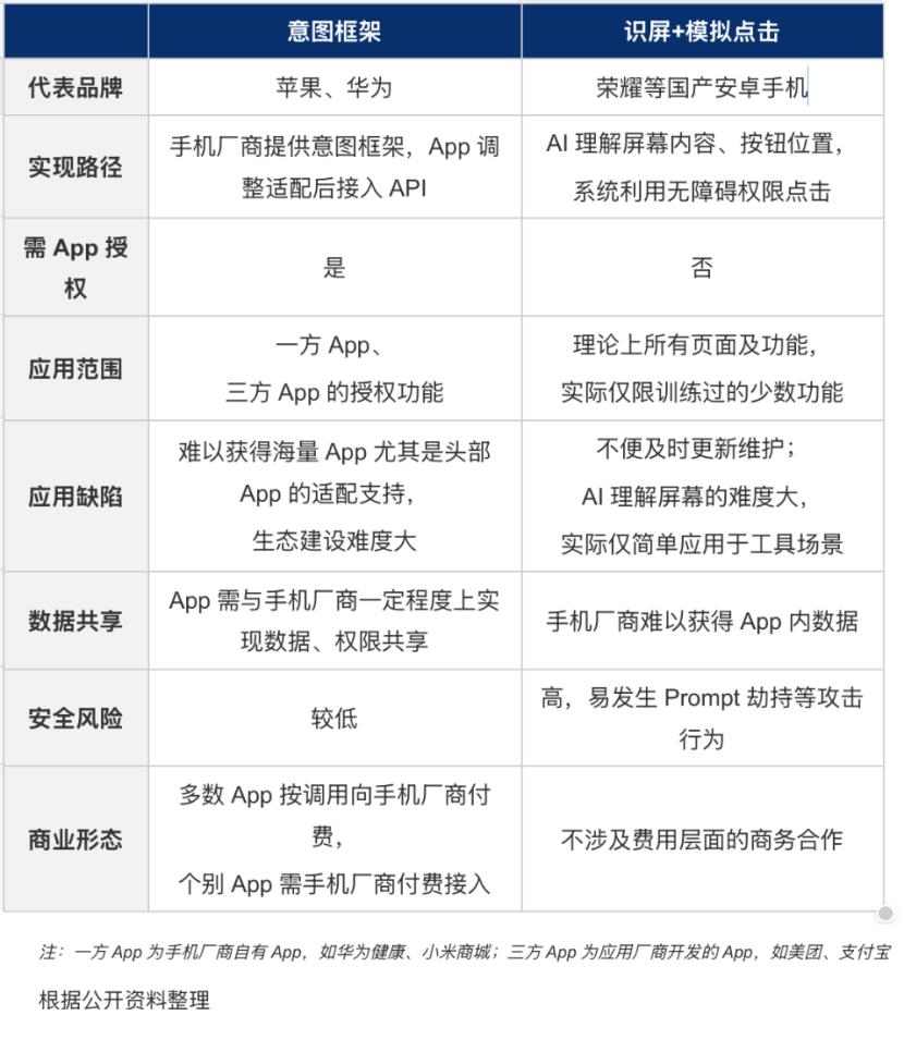 据业内人士透露,“在本轮AI大赛中,手机厂商已经发展出了两条技术路线,一条是‘签约意向框架’,一条是‘模拟客户识别屏幕 模拟点击“操作”。