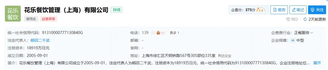 据公开资料显示,2006年,由日本稻田公司董事长稻田2000武(创建了世界上第一家家用按摩椅企业)创建的花朵在上海正式开业。该店是当年著名的天妇罗品牌,但由于经营不佳,2017年上下关闭。天眼查显示,华乐餐饮管理(上海)有限公司成立于2005年,其中一家股东是稻田2000武,已被上海市市场监督管理局列入业务例外名单。