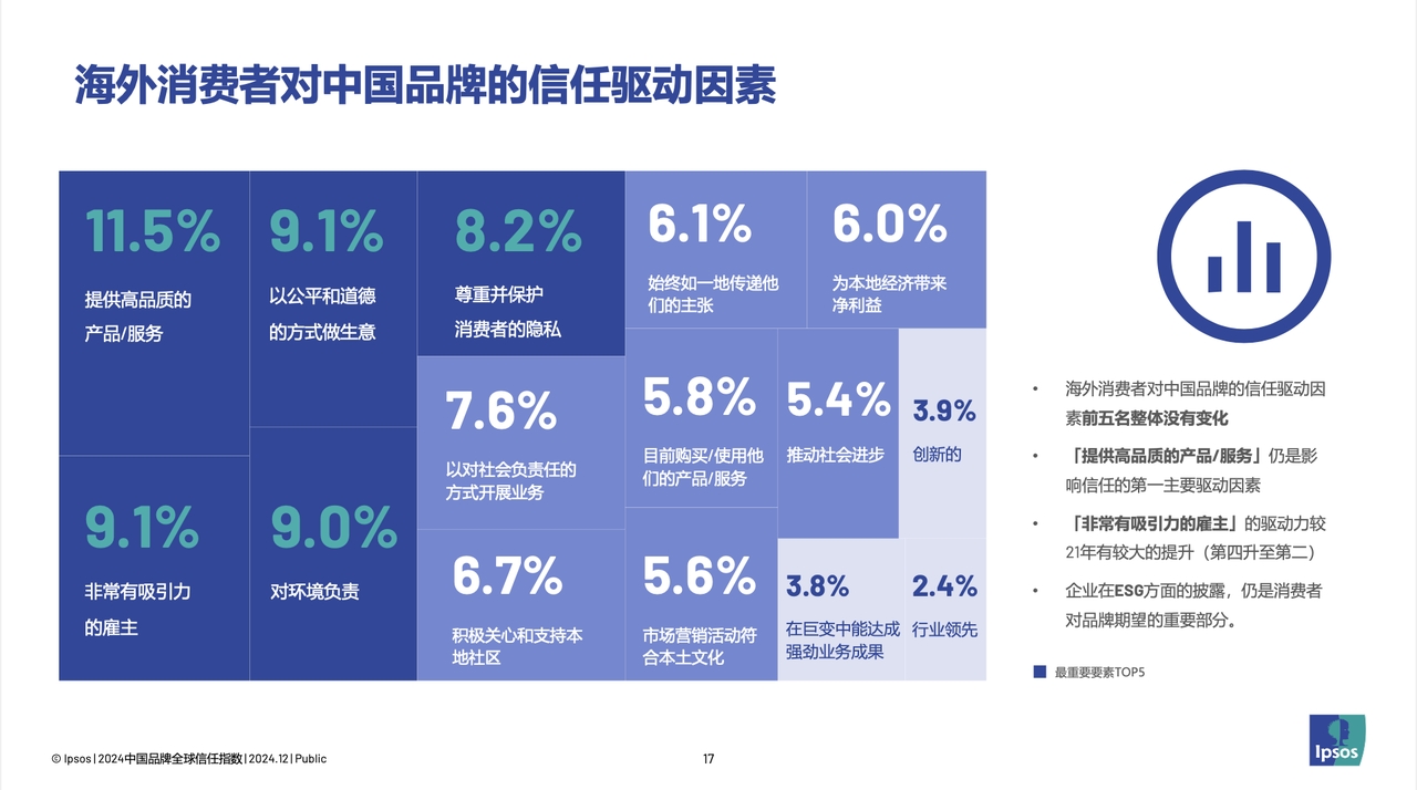 从数据来看,中国企业出海的品牌影响力正在加快。根据市场研究和咨询公司益普索近日发布的《2024年中国品牌全球信任指数》报告,中国品牌海外综合信任自2021年以来增加了14%,若时间轴延长至5年,信任度总体增加20年%。